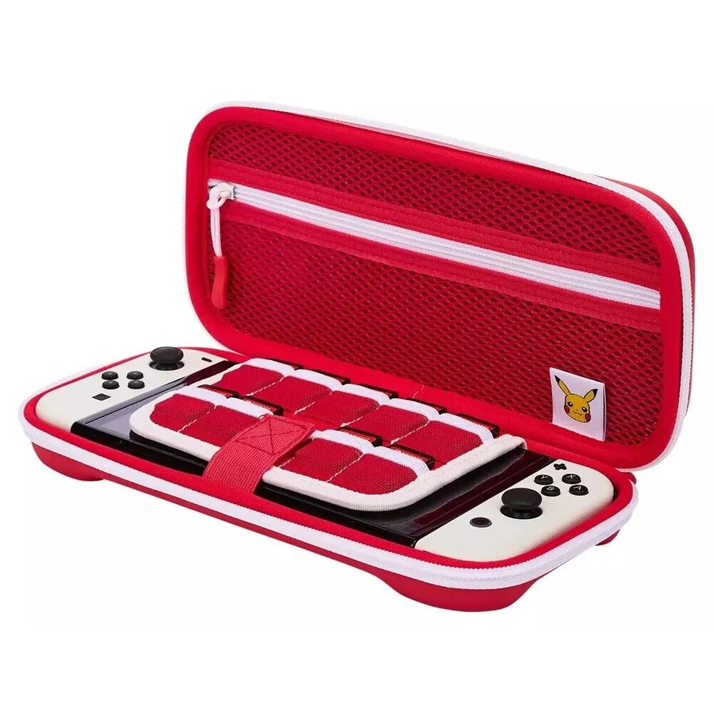 O estojo protetor PowerA para Nintendo Switch no design Pikachu oferece uma solução resistente e compacta para transportar seu console com total segurança. Seu design fino não compromete a proteção do seu Nintendo Switch ou Switch Lite, tornando-o ideal para acompanhá-lo em todas as suas aventuras. Com uma alça resistente e um zíper durável, este estojo garante a durabilidade necessária para o uso diário. Seu interior moldado possui um forro de feltro que adiciona uma camada adicional de proteção.